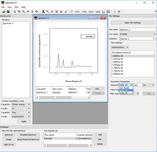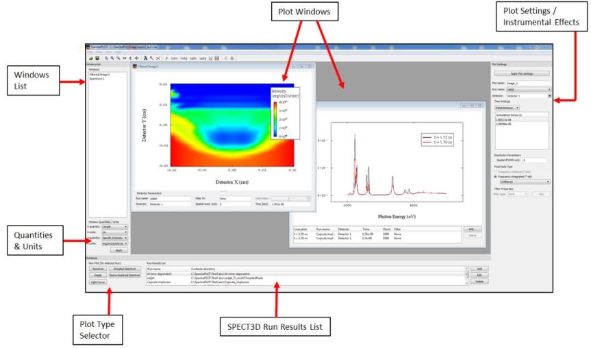 SpectraPLOT features a user-friendly graphical interface for viewing a wide variety of results from SPECT3D simulations, and applying various instrumental effects to the simulated images and spectra, such as time integration, spectral resolution, and spatial resolution. It has been designed to run on multiple platforms (Windows, Linux, Mac).