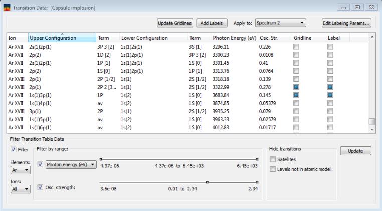 To modify transition parameters, users select one or more transitions from the upper table (see below), which contains a list of all available transitions. In the upper table, transitions can be filtered by: element, ionization stage, photon energy or wavelength, oscillator strength value (bound-bound transitions), and type of transition (bound-free, bound-bound, satellites, and/or virtual transitions can be excluded).