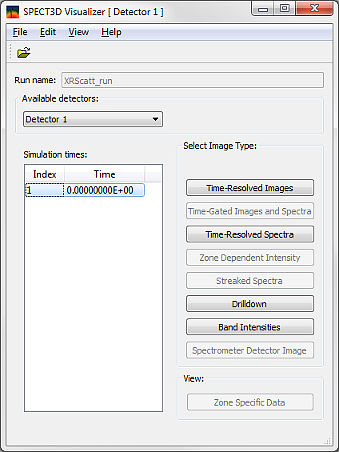 Results of Spect3D calculations can be viewed with the Visualizer utility. Visualizer can be started at the end of the calculation or at any time after the calculation is completed by double-clicking on the file <run_name>.swc in <run_name> directory (in this example XRScatt_run.swc). The Visualizer main window appears. Depending upon the type of the calculation, some of the options may be disabled.
