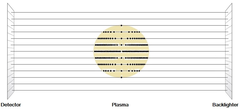 For Orthographic Projection, the rays eminating between each of the pixels in the detector grid and the backlighter are parallel. The intensity originating from the backlighter is assumed to be spatially uniform. A schematic illustration of the Orthographic Projection viewing model for a rectangular detector is shown below for a 2D cross section. The points in the plasma represent intersections of the rays with walls of the plasma volume elements.