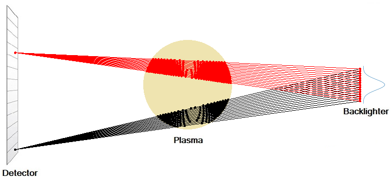For Point Projection, a Distributed backlighter results in each detector pixel drawing a ray to each of the points in the backlighter distribution, as defined in the user interface. A schematic illustration for a rectangular detector is shown below for a 2D cross section. The points in the plasma represent intersections of the rays with walls of the plasma volume elements. For simplicity, the illustration only shows rays for two of the detector pixels.