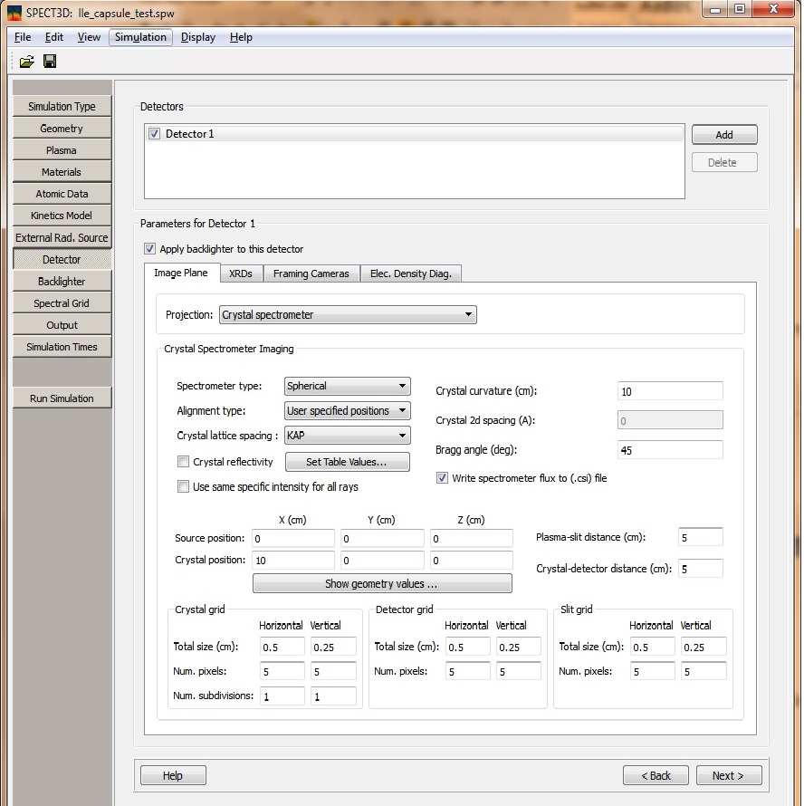 Controls for the crystal spectrometer calculation can be accessed from Detector settings by selecting Crystal spectrometer for the projection type. The following figure shows the crystal spectrometer user interface controls for an example calculation: