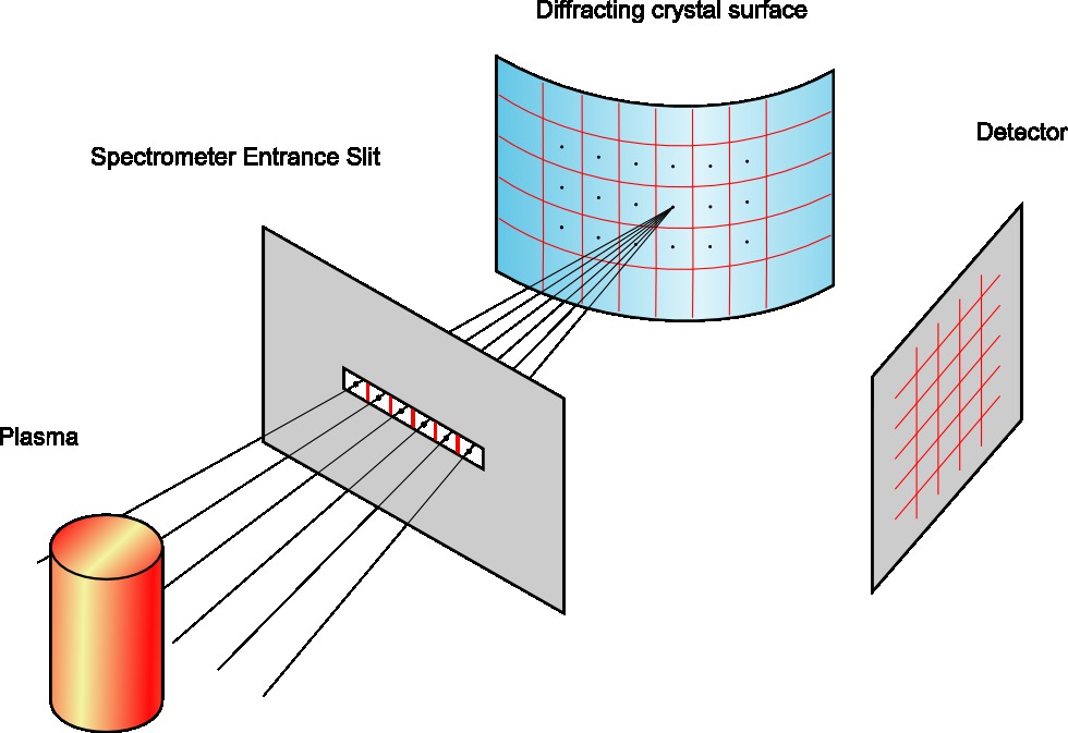 For the Crystal Spectrometer Imaging Model, a series of rays are projected from each pixel in the detector grid onto the surface of a curved crystal. The rays are reflected off the crystal surface then must pass through an aperture and intersect the plasma in order to contribute to the total intensity at the detector. For each detector pixel, the range of angles over which the rays hit the crystal surface determines the photon energy range detected (via. Bragg diffraction).