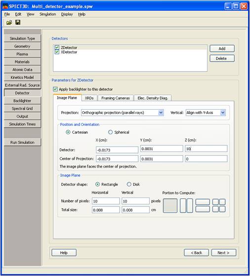 When setting the detector position, viewing geometry, and backlighter position (if applicable), it is often useful to graphically view the relative orientation of these components relative to the plasma. This can help ensure that the detector is viewing the portion of the plasma intended to be viewed by the user. To display the detector-target orientation, see the Detector/Target View.