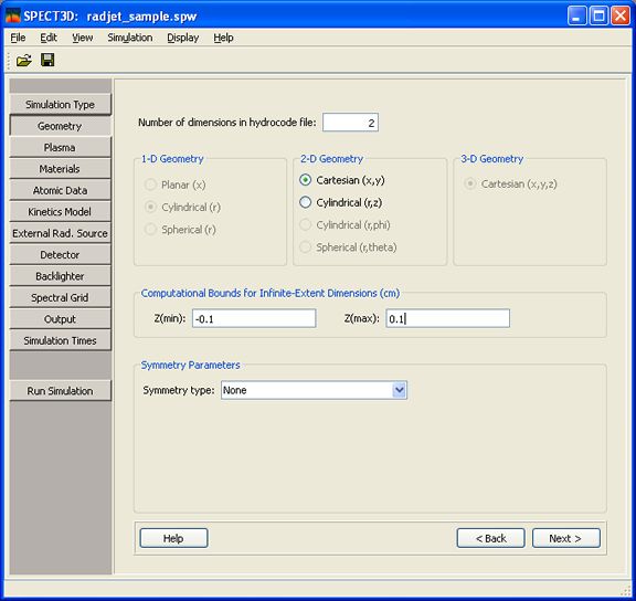 The Geometry setup widget is used to specify the geometry of the plasma. This is the geometry used in the radiation-hydrodynamics (or PIC) simulation. (This widget is not displayed in the case of a single-cell plasma calculation.)
