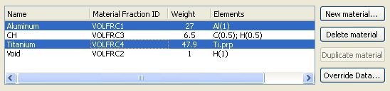 The temperature, density and vapor fraction data in a hydro file can be overridden for one or more materials by selecting the materials on the Materials widget and clicking on the Override Data... button. Ion feature for x-ray scattering model can also be overridden.