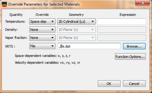 - The space or velocity dependent variables that will be recognized in the override expression are listed in the dialog box.