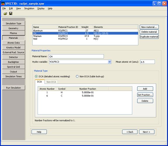 Setup of SPECT3D simulations is performed by cycling through a series of "widgets" that contain parameters for: