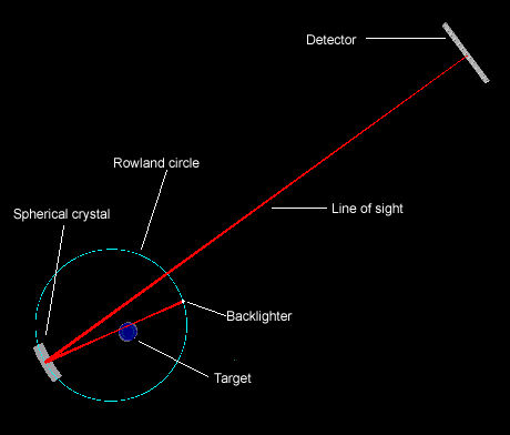 For the Spherical Crystal Projection Model, the rays emanating from each of the pixels in the detector grid reflect off a spherical crystal, and pass through the plasma to a small backlighter. The backlighter is located on the Rowland circle of the spherical crystal.
