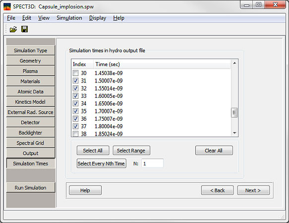 For a calculation in which steady-state atomic level populations are computed, all plasma properties at a given time are independent of the plasma state at all other times. In this case, SPECT3D computes the radiative output from the plasma at one or more of the simulation times available in the hydro output file.