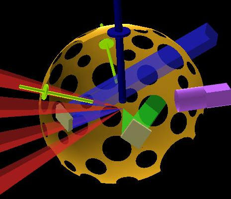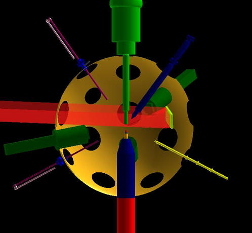 The image below shows an example of the OMEGA target chamber. The short-pulse "EP" beam, which reflects off an off-axis parabola near port H7, is shown in red.
