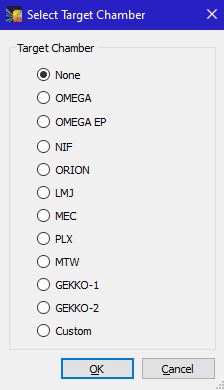 Upon starting a new application (whether starting VISRAD or selecting File | New), the user is presented with a list of target chambers available for selection (see below). VISRAD then sets up the appropriate laser beam and diagnostic port systems.
